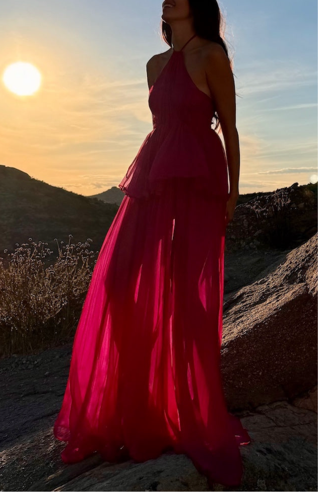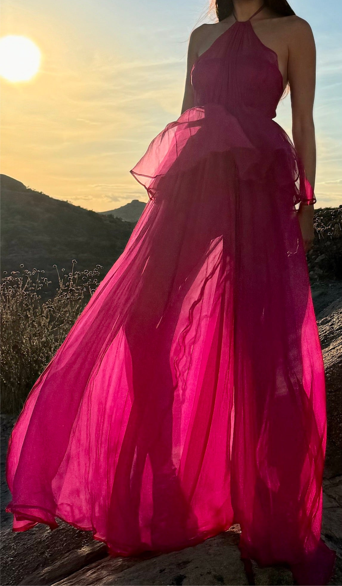 Draped by our skilled artisans to achieve a stunning flowing effect, this haltered evening gown showcases the ethereal nature for which the house is known.